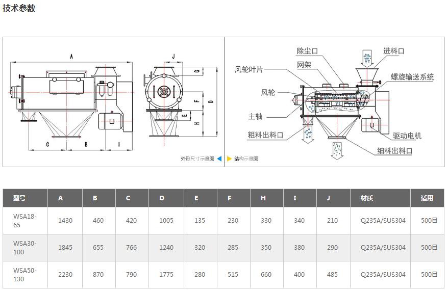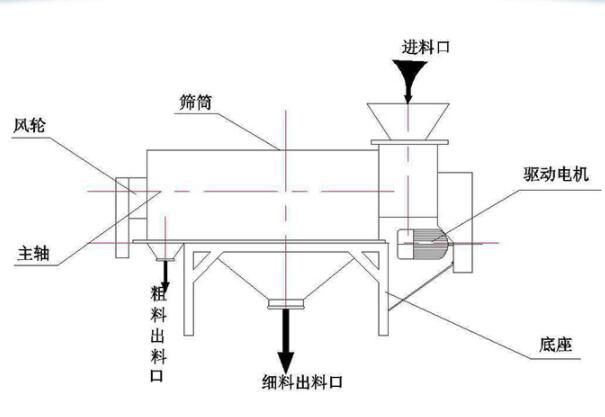 本设备筛网为圆筒状,置于机体内,物料通过螺旋输送系统后与气流混合、雾化进入网筒内,通过网筒内风轮叶片使物料同时受到离心力和旋风推进力,从而使物料喷射过网,过网的物料从细料排出口排出,不能过网的物料沿筒壁从粗料排出口排出,达到有效分离的目的。