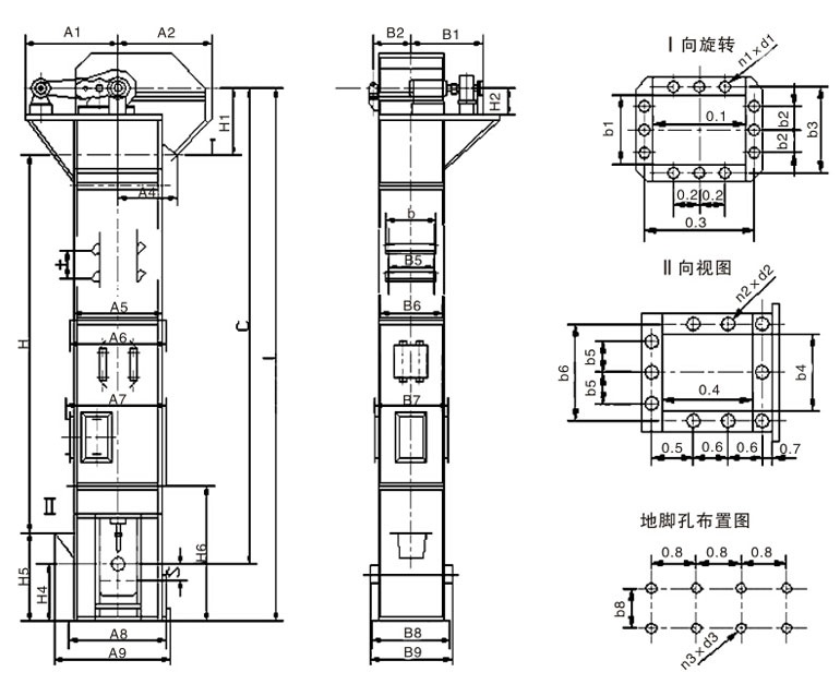 TD型斗式提*机(胶带斗式提*机)由运行部分(料斗与牵引胶带),带有传动滚筒的上部区段,带有拉紧滚筒的下部区段,中间机壳,驱动装置,逆止制动装置等组成,适用于向上输送松散密度ρ<1.5t/m3粉状、粒状和小块状的无磨琢性和半磨琢性散状物料,如煤、砂、焦末、水泥、碎矿石等。 TD型斗式提*机结构形式为:TD型斗式提*机的传动装置有两种形式分别配有YZ型减速器ZQ(或YY)型减速器。YZ型轴减速器直接装在主轴轴头上,省去了传动平台、联轴器等,使结构紧凑、重量轻,而且其内部带有异型辊逆止器,逆止。该减速器噪音低,运转平稳,并随主轴浮动,可消除安装应力。