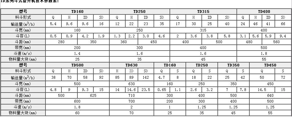 TD型斗式提*机具有以下特点:1、输送量大,相同斗宽的TD型与D型相比,输送量增大近一倍:2、牵引件采用强度高橡胶输送带具有较高的抗拉强度,使用寿命长。3、整机结构简单、安装方便、便于调整、维修和保养。 4、牵引件为低合金强度高园环链,经适当的热处理后,具有很高的抗拉强度和耐磨性,使用寿命长。本提*机为离心式或混合方式卸料,掏取式装料,适用输送堆积密度不大于1.5t/m3的粉状、粒状、小块状的低磨琢性物料,物料的温度不得过60度。 本系列斗式提*机备有四种料斗:Q型(浅斗)、H型(弧底斗)、zh型(中深斗)、sh型(深斗),分别输送各种物料,用户可以根据物料特性来选择适当得料斗。本提*机代号为TD,即带式斗式提*机;产品规格以斗宽表示。